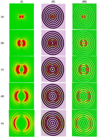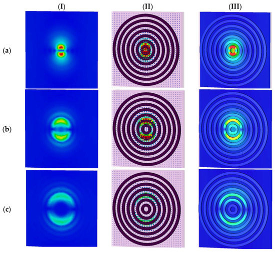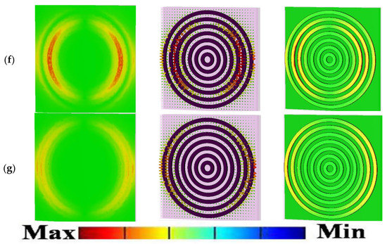 As can be seen from Figure 6, we plotted the electric fields distributions and the excited surface plasmons as the surface current energy densities of the proposed microstructure in the XY-plane at different resonance frequencies. Column I in Figure 6 shows the electric field distribution at Z = 36 nm. Column II show the surface current electric energy densities, and column III shows the excited surface plasmons as the electric field distributions at Z = 25 nm. As clearly observable in row (a) of Figure 6, the innermost and smallest ring with a radius of is strongly coupled to the electric field at the mode of 1.55 THz. It supplies an independent electric dipole response (see Figure 6a, columns I to III), and the surface charge oscillates the most along the sides driven by the external electric field. Therefore, it can be concluded that in this case, mode and its corresponding absorption peak resonance is mostly due to the excitation of RR antenna. The magnetic component of the incident wave penetrates between the top and bottom layers and generates an antiparallel surface current on the RR antennas and the ground semiconductor plane, leading to the magnetic coupling and the response (see Figure 7a, columns I to III).