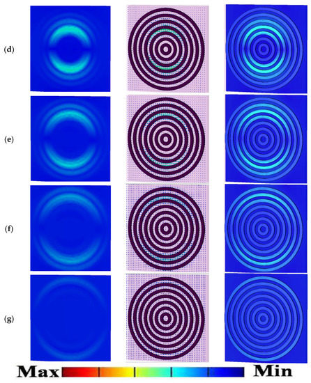 To obtain an insight into the origin of the multi-beam absorption, we focused on the EM response of the case with the seven RR antennas (i.e., unit cell G) at normal incident light in TE/TM polarization modes (the proposed microstructure is a polarization-independent design, as can be seen in Figure 4). We defined every absorption peak resonance as an mode, where i refers to the specific RR antenna which is more excited in that resonance frequency; for example, the mode refers to the RR antenna with the radius of in Figure 1. We monitored the electric and magnetic fields and surface current densities on the top and bottom layers of the structure in the XY-plane at resonance frequencies of modes, as shown in Figure 6 and Figure 7, respectively.