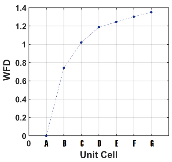 The WFD parameter for unit cell A should be zero because of the excitation of only one mode, due to the creation of one absorption peak resonance. As seen in Figure 8, the WFD value is the maximum for the case of unit cell G due to the excitation of the seven-beam absorption from a frequency of 0.2 THz to 1.55 THz. Therefore, it can be concluded that, by adding the number of RR antennas, the WFD increases due to excitation of higher order modes because of the existence of more RR antennas in the device.