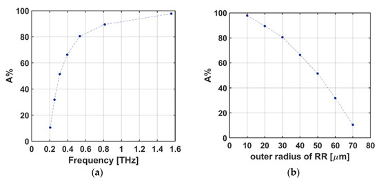 We plotted Figure 9 to show the absorption percentage (corresponding to the absorption high) in any specific frequency for the case of unit cell G and investigated the strength of every RR antenna (with outer radius) corresponding to every mode (). As clearly seen in Figure 9a,b, the first/last and highest/shortest absorption peak is approximately 97.8/10.5% which refers to the innermost/outermost RR antenna (i.e., the RR antenna with an outer radius of ) which occurs at approximately THz.