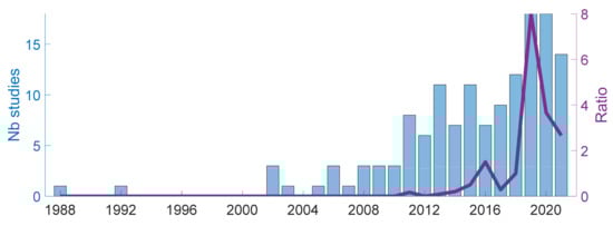 Distribution of the studies over the publication years (blue bars), and ratio of the number of studies using a smartphone or derivative recording system over fix and traditional systems (violet line).