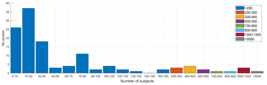 Many studies tend traditionally to rely on a relatively small number of subjects in their database, typically less than 45, emphasizing the difficulty to collect and process such data, as well as the preliminary character of many studies (Figure 3). A few studies have larger databases. The larger ones contained, respectively, 141 [183] and 5320 [45] subjects for the pure detection and classification studies. Two studies considered only one subject [130,131]. As expected, we observed the size of the databases increasing over time, boosted by the recent crowdsourcing data collection approach, as emphasized by the linear regression plotted in Figure 4.