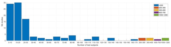 Mirroring the observation made on the overall databases, many studies tend also to rely on a relatively small number of test subjects, typically less than 30 (Figure 5). Testing requires indeed arduous manual labeling of audio data to identify the coughs. The number of samples per subject varied greatly between studies. As a result, the number of subjects characterized the variety of the test data but not their amount. Two studies [45,49] considered, for instance, more than 1000 test subjects. Thirteen other studies tested their systems on more than 100 subjects [29,33,48,52,53,70,81,86,96,107,108,109,114], including all the crowdsourced-based studies for which the number of test subjects was disclosed. All 15 studies dealt logically with cough classification, where the data consisted usually of a few coughs per subject at maximum, unlike cough detection, which usually considered long-term recordings for a few subjects and for which data labeling was much more challenging. The highest number of test subjects for a detection study was reported to be 59 [75]. As noted earlier for the databases, we observed an increase of the number of test subjects in the last years, boosted by the recent research on COVID-19 and crowdsourcing data collection [45,47,48]. Finally, we observed 54% male vs. 46% female test subjects.