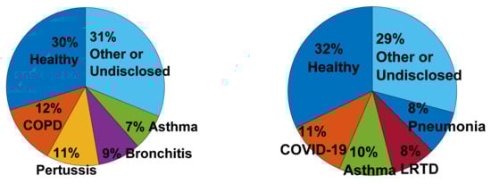 The health profiles of the test subjects, according to the categories provided by the authors of the studies, are reported in Figure 6 (The two studies with more than 1000 test subjects [45,49], consisting of 29% COVID-19 patients and 71% healthy subjects, were discarded, as they largely outnumber the number of subjects of the other studies and bias the display). About a third of the test subjects were healthy: for cough detection, they were suitable for a proof-of-concept study, and for cough classification, a pathology is often diagnosed against its absence, necessitating the presence of healthy control subjects. Asthma patients represented about 10% of the test subjects for both study types. COPD, pertussis and bronchitis patients represented each of them about 10% of the test subjects for the detection studies and Lower Respiratory Tract Disease (LRTD) and pneumonia patients again about 10% of the test subjects for the classification studies. Finally, despite discarding two studies [45,49] on the figure, already, 11% of the test subjects of the classification studies were COVID-19 patients, making this disorder the most studied in terms of test subjects. This figure represents the number of patients; representing the number of studies per disease would provide slightly different and complementary information, discarded for space reasons.