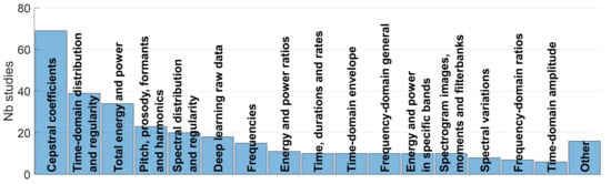 The most frequent feature observed is by far the Mel-Frequency Cepstral Coefficients (MFCC), typically a set of 13 coefficients [197], present in 59 studies. It is followed by the ZCR, representing the frequency of zero crossing of the time domain signal and whose values are supposed to be higher for noisier and higher frequency signals, present in 31 studies. The third one is the energy, supposedly high in presence of cough, especially for the explosive phase, present in 14 studies.