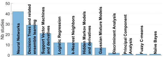 27 different classifiers have been identified. The classifiers not retained in the final solution provided by the authors were discarded. The classifiers sharing analogous approaches have been grouped together to form categories. The Support Vector Machines (SVM) and derivatives category encompasses the classical SVM classifiers ([48,53,54,74,77,84,89,92,97,101,117,118,121,136,138,158,169,192]), its use in ensemble learning [159] and the Sequential Minimal Optimization, an implementation instance of it ([165,166]). The Decision Trees and related ensemble learning category encompasses the classifiers based on a simple Decision Tree ([29,73,88,122,123,130,131,140,151,152,160,161,178,191,192]), as well as the Random Forest classifier, using a multitude of decision trees and taking a final decision by voting ([29,70,74,96,111,112,113,134,135,170,184]), and ensemble decision trees based on boosting ([29,51,59,169]) and bagging [153]. It ranges from very simple trees based on expert observations (i.e., References [73,160,178,192]) to very recent approaches based on ensemble learning (i.e., References [29,153,169]). The Hidden Markov Models and derivatives category encompasses the Hidden Markov Models ([69,76,127]), inherited from the speech recognition research and particularly adapted to model times series [176], as well as its implementation where the observation probabilities are generated by Gaussian Mixtures ([14,68,133,145,175,176,177,180]) and by deep neural networks ([143,180]). The Neural Networks category encompasses all the neural networks, from the most simple ones with limited size and limited hidden layers, or supposed so ([22,27,69,111,132,156,162,174,182]) to the state-of-the-art deep networks ([29,55,85,87,110,148,149,183]), including the Convolutional Neural Networks ([45,46,47,52,54,78,80,86,126,129,137,144,154,155,171,185,186,187]), the Time Delay Neural Networks ([84,150]), the Recurrent Neural Networks [49,50,56,155,172], the Generative Adversarial Networks [80] and the Octonion Neural Networks [157]. The other classifiers are the Logistic Regression ([48,58,75,83,90,91,93,94,95,100,147,163]), the k-Nearest Neighbors (kNN) ([49,81,104,119,120,124,125,138,141,142,146,164]), the Principal Component Analysis [33], the Fuzzy C-means [99], the Gaussian Mixture Models ([78,98,102,103,128,168,173]), the Discriminant Analysis [30,116] and the Naïve Bayes [153]. Their usage is presented in Figure 8: the two most popular classification approaches are the Neural Networks and the Decision Trees and related ensemble learning.