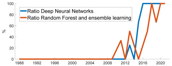 Time evolution of the ratios of the number of deep neural network studies in the “Neural Networks” category (blue) and of the number of random forest and ensemble learning studies in the “Decision Trees and related ensemble learning” category (orange).