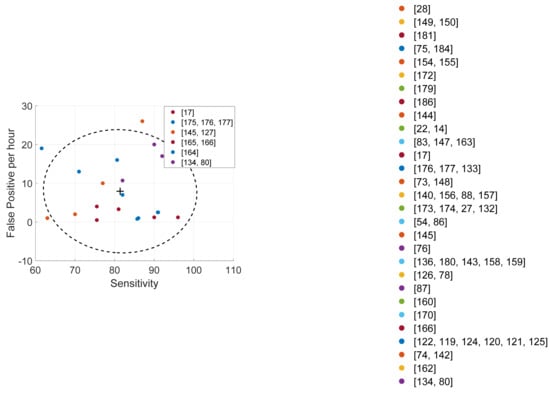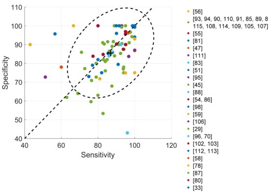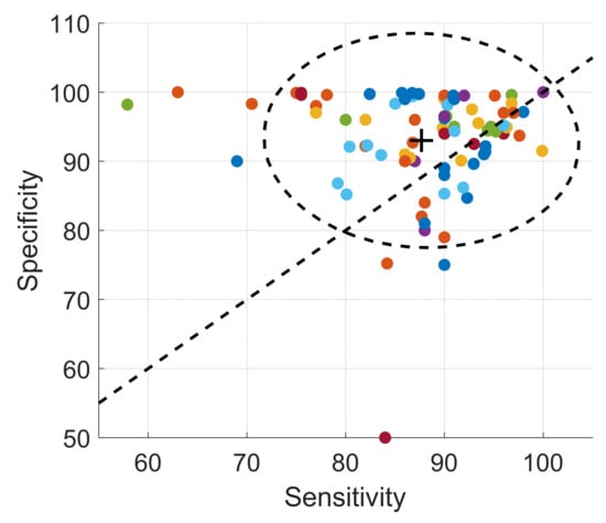 Specificity vs. sensitivity for the experiments of the cough classification studies. Each research group is associated with a specific color. The dashed line represents the specificity = sensitivity line and the dashed ellipse the 95% confidence ellipse.