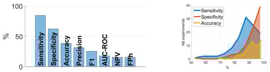 The number of samples for the two classes are usually of the same order and interchangeable, making the sensitivity and specificity two comparable complementary measures. A sample is usually one cough event. 81 sensitivity-specificity pairs have been gathered, displayed as percentages in Figure 10. Multi-class classifications (e.g., Reference [98]) have been split into several binary classifications and missing values have been recalculated when possible. Most results show comparable values higher than 75% in terms of sensitivity and specificity. The 95% confidence ellipse shows a good balance between sensitivity and specificity, centered around 85%. Further pairwise comparisons between studies remain however very hazardous given their specificities. As an illustration, the number of test subjects ranges from 8 [87] to 1064 [45] and of test cough samples from 16 [79] to 8380 [47]. Some studies consider one sample per subject while some others many samples per subject.