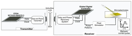 Block diagram of the system. XC7A35T version FPGA is used to generate data and clock signals on the transmitter side and is transferred through an inductive link. The receiver comprises data and power recovery systems, a global digital controller, and a pixel simulator.