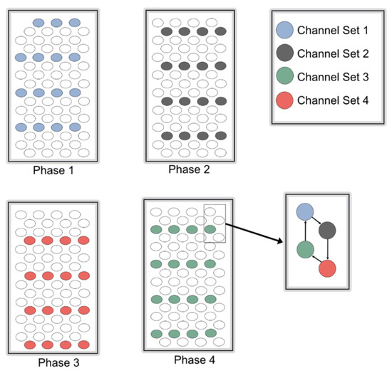 Pattern of electrode stimulation. Each phase shows a specific interval of stimulations of a single channel set, while hexagonal pattern of stimulation is shown in a small box.