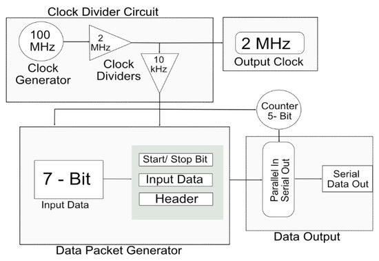 Seven-bit external data were input to the transmitter FPGA. The data were input in the form of 0 s and 1 s, which gave a total of 128 combinations. Each combination was responsible for the shape and amplitude of the biphasic pulse. The input data were combined with the start bit, 24-bit header, and stop bit. The start bit indicated the start of the new data packet. Each data pattern had a specific header that provided the address of the data and verifies the data packet. The stop bit acted as parity and indicated the end of the data packet. The 32-bit parallel data were input into a multiplexer that converted it into serial data. A five-bit counter acted as a selection line for the multiplexer and each bit of the data packet was transferred to each pattern of the selection line.