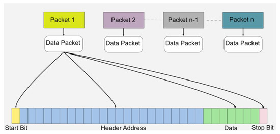 Data on the transmitter side were generated based on the light transmitted through the FGPA. For data transmission, a specific data packet was generated, which included a start bit indicating the start of a new packet, followed by a specific, fixed 23-bit address of the data. This indicated the type of data transmitted and verified the correct data packet. Once the header was verified, seven-bit variable data were processed, and the stop bit, which also acted as parity, indicated the end of the data packet. Figure 4 shows the data packet structure.