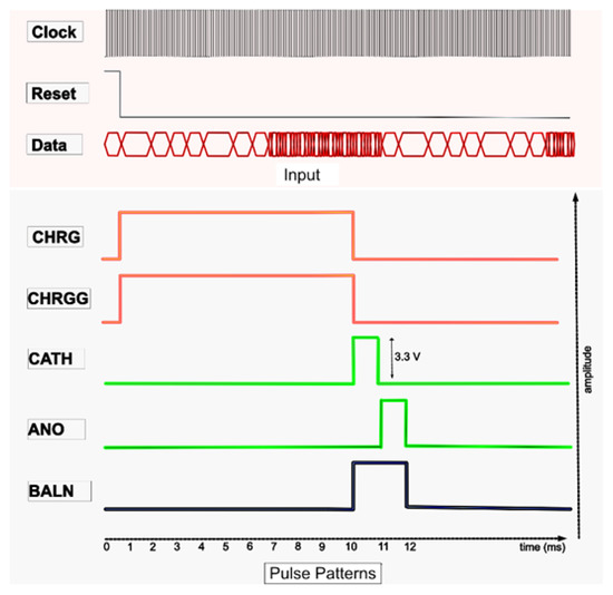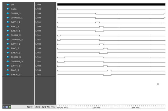 ModelSim v10.3e was used as the simulation tool for digital control. Figure 10 shows the simulation results of the digital controller on ModelSim for the two sets of channels. CHRG and CHRGG were simultaneously generated for 10 ms in this simulation. CATH and ANO, each for 1 ms, were consecutively generated to generate a cathodic-first pulse. A BALN pulse with a CHRG was produced.