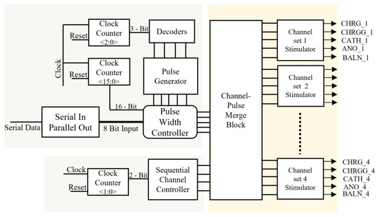 - The stimulator array had four sets of channels, each of which comprised 16 pixels, as previously explained. Each channel set for stimulation was specified in the channel control block and merged with the width and delay control pulses in the channel-pulse merge block.