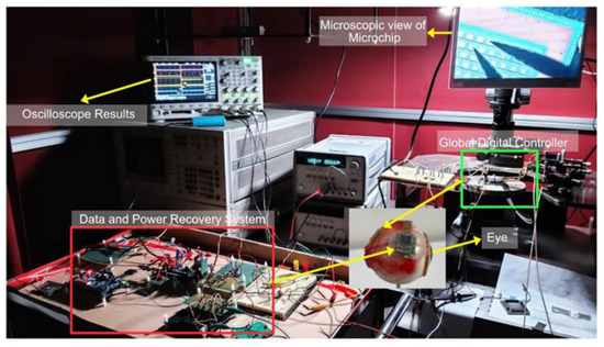 Design Vision e-2013 was used to synthesize the Verilog code and design layout after verifying the synthesized code. To manufacture an integrated circuit chip, a 0.35 μm SK Hynix CMOS standard process was used. A digital controller would be implanted inside the eye, which was fabricated on the same chip as a pixel stimulator, reducing the size and external connections. Figure 7 shows a photograph captured during the testing of the complete system. Figure 8 shows the layout generated and the fabricated chip.