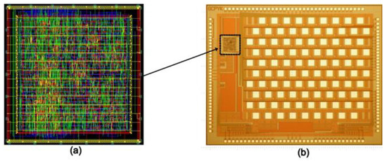 (a) Layout of digital controller embedded onto a chip (with an active area of 450 × 460 µm2); (b) microscopic view of 64-pixel fabricated microchip (with an active area of 4.3 × 3.2 mm2).