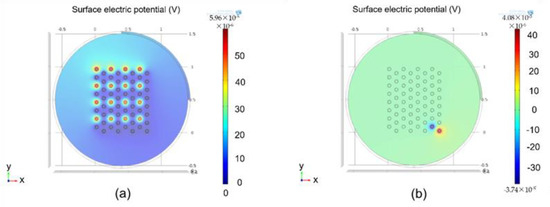 Simulation results calculated: (a) results calculated using COMSOL when a complete channel set was activated; (b) results calculated using COMSOL when two channels were activated simultaneously.