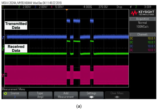 Transmitted and received data through a wireless telemetry system are displayed, along with ASK demodulated data, in Figure 11a. The data on both the transmitter and receiver sides were completely synchronized. Figure 11b shows the timing diagram of the current pulses using the FPGA. The width of the pulses can vary depending on the light source.