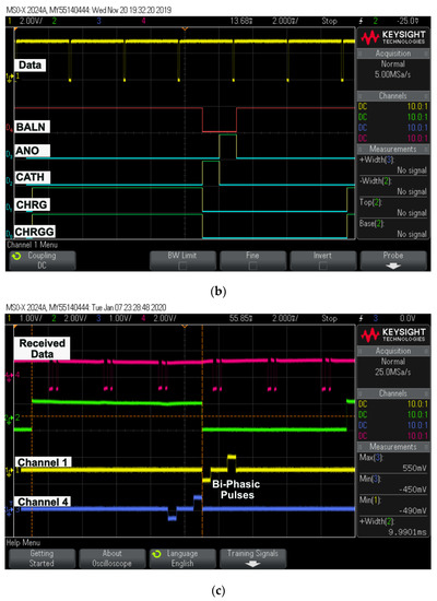 Figure 11c shows biphasic pulses generated for two different channels sequentially on a digital controller designed and fabricated on 0.35 μm microchip technology with respect to the data.