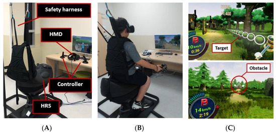 An HRS with VR was developed for the rehabilitation of children with CP. It consists of a horse-riding simulator (Shinhwa EQ-900, Seoul, Korea) with a safety harness and a head-mounted display with a pair of controllers (Odyssey, Samsung Electronics, Suwon, Korea) for an immersive VR experience (Figure 1). Upper extremity activity and trunk motion applied to VR simulation were precisely designed and tuned by a pediatric rehabilitation doctor (H.J.C.). In addition, playtime and difficulty in the VR scenario were developed in consultation with the rehabilitation team considering the condition of the children participating in the study Following the development of HRS with VR, 10 typically developing children (TDC) experienced riding on the HRS with VR before clinical trials for children with CP. No adverse events such as falls, VR sickness, or pain occurred.