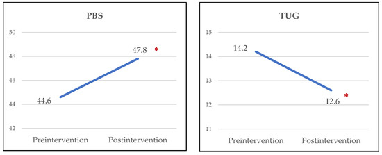 Changes in Pediatric Balance Scale (PBS) and Timed Up and Go (TUG) test. * Statistically significant difference between pre- and postintervention (p < 0.05).