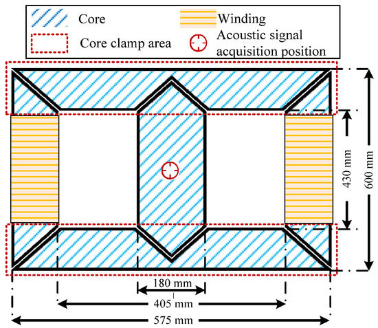 Most of the energy in the transformer acoustic signal is contributed by the core vibration. Therefore, a core model was made to simulate a transformer acoustic signal in the laboratory. The silicon steel sheet used in the model is B30P105, and its geometric dimension and signal acquisition layout are shown in Figure 2. In the aspect of acoustic acquisition, the same acquisition equipment as in Section 3.1 is used, which will not be repeated here. The excitation power supply equipment meets the test performance index of sinusoidal AC and DC bias. The whole core acoustic test platform is shown in Figure 3.