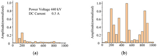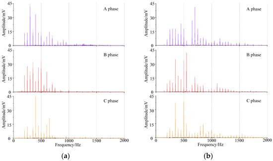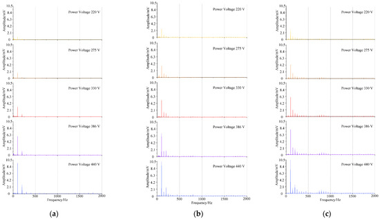 The acoustic frequency domain signal of the core model under normal state and DC bias state is shown in Figure 5. The frequency spectrum is mainly distributed at integer multiples of 50 Hz, and the fundamental frequency (100 Hz) is the most important frequency. When the voltage rises, the amplitude of the transformer’s acoustic spectrum increases as a whole, and the proportion of each frequency in the total energy is almost unchanged; when the current of DC bias in the excitation of the transformer gradually increases, the proportion of the odd harmonics will increase, the high frequency component is gradually increasing, and the dominant frequency is stable at the fundamental frequency of 100 Hz.