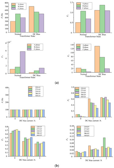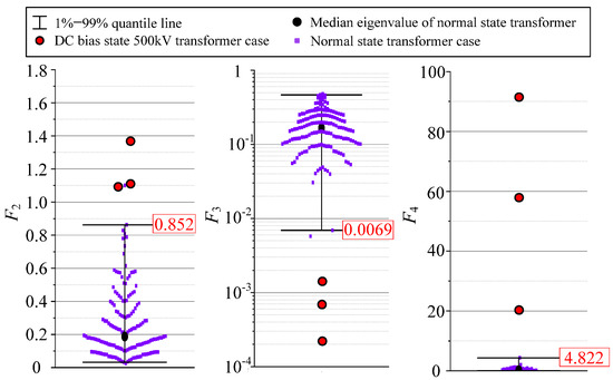 In order to test the effectiveness of the warning threshold set above, in this paper, the DC bias state 500 kV transformer cases in Section 3.1 are compared to the parameters warning threshold, and comparison results are shown in Figure 12: F2, F3, and F4 of DC bias state 500 kV transformer cases all exceed the warning threshold. The comparison results show that the early warning threshold given according to the statistics of three parameters can identify the DC bias state.