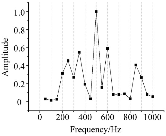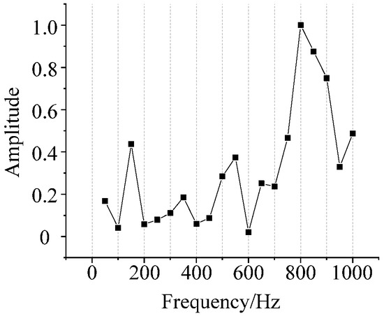 From the investigation work of [29], the frequency response function of the oil and tank H(f) is extracted. After normalizing, H(f) is shown in Figure 7. However, the upper limit of the frequency response function given in [29] is 1000 Hz. Therefore, only the amplitude of 0–1000 Hz of the spectrum can be calculated during the example verification.