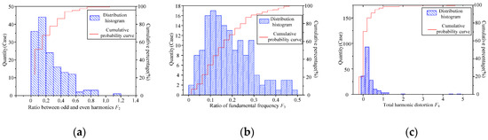 Distribution histogram and cumulative probability curve of transformer acoustic typical eigenvalues. (a) Ratio between odd and even harmonics F2. (b) Ratio of fundamental frequency F3. (c) Total harmonic distortion F4.
