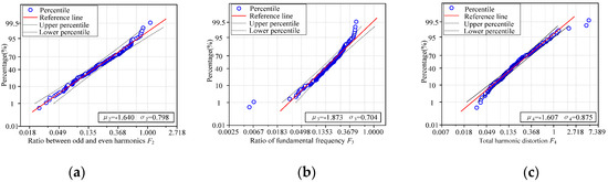 Lognormal probability plots of transformer acoustic typical eigenvalues. (a) Ratio between odd and even harmonics F2. (b) Ratio of fundamental frequency F3. (c) Total harmonic distortion F4.