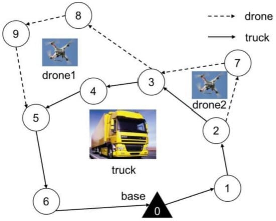 In this study, the target surveillance problem focuses on how to rationally plan the routes of trucks and drones to improve the surveillance efficiency and minimize the total cost. However, the limited endurance of a single drone makes it difficult to surveil large-scale targets distributed over a wide range [12]. Therefore, we study the target surveillance routing problem by cooperatively using a truck and multiple drones to surveil targets. As shown in Figure 1, the truck, which is loaded with multiple drones, starts at the base, surveils its targets and then returns to the base. Drones can take off and land from the truck. After a drone takes off, it can surveil multiple targets and then return to the truck within its maximum flight range. As shown in Figure 1, drone1 takes off at the 3rd target and surveils the 8th and 9th targets. Then, it returns to the truck at the 5th target. The 3rd and 5th targets are surveilled by the truck. By this process, the truck increases the drone’s surveillance range. Besides, the truck has enough energy when conducting the surveillance mission and both trucks and drones can surveil targets.