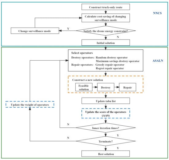 In this section, the proposed ASALN algorithm is presented. The destroy operators and repair operators designed in ASALN are described, and the adaptive adjustment strategy developed in ASALN is presented to dynamically select the destroy and repair operators. In addition, simulated annealing is introduced as an iterative optimization framework, and the tabu list is utilized to avoid short-term loops and make the routing algorithm for trucks and drones more effective.