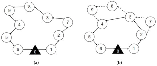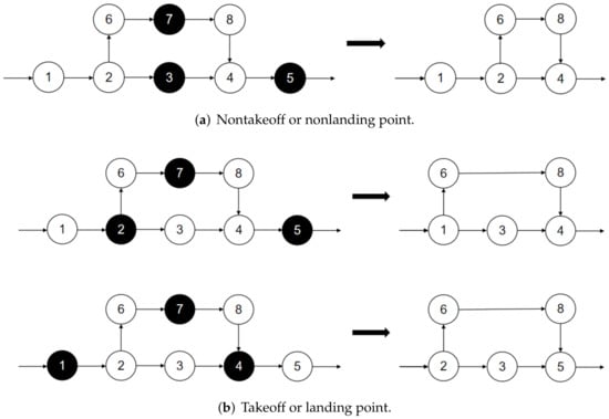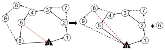 Considering that the drone must take off or land from the surveillance target visited by the truck, the destroy operation is divided into two types, as shown in Figure 4a. If the selected target does not include the takeoff or landing point of the drone, it can be deleted directly. If the selected target consists of the takeoff or landing point of the drone, as shown in Figure 4b, a new takeoff or landing point needs to be constructed when the drone takeoff or landing point is deleted. Specifically, if the drone takeoff point is deleted, the previous point is taken as the new drone takeoff point; if the drone landing point is deleted, the next point is taken as the new landing point.