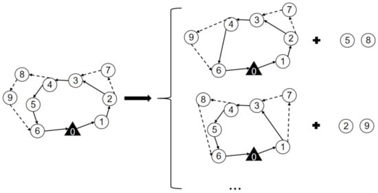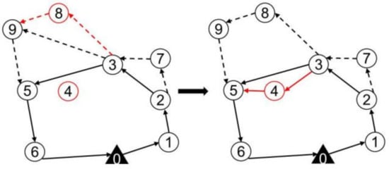 The maximum savings destroy operators remove the q surveillance targets with the highest cost increase in the route of the truck and drones. Thus, a partial solution is missing q surveillance targets and has q removed surveillance targets, as shown in Figure 6. For solution s, the cost savings of removing target i are defined as , where is the cost of the current solution and is the cost of the solution after removing surveillance target i. The cost savings for each surveillance target are calculated and recorded, and the surveillance target with the largest cost savings in the existing solution is removed. Then, the current solution is updated, the cost savings of all surveillance targets are recalculated, and the surveillance targets with the largest cost savings are deleted. This process is repeated until q surveillance targets are deleted. The maximum saving destruction operator makes the algorithm obtain a smaller cost portion of the solution , and the surveillance targets have more costs removed. The reconstruction of the route may cause the targets to be inserted into a different location than the current solution, which will reduce the cost of the surveillance problem.