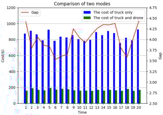 Comparison with truck-only surveillance mode: Two different surveillance modes, i.e., the cooperation of truck and drone target surveillance ASALN and truck-only (TO) target surveillance, are compared. From Table 4, it can be observed that the mode of cooperation of trucks and drones can dramatically reduce the total cost compared to that of the truck-only mode. With the assistance of drones, the final cost generated by the ASALN is more than 70% lower than that of the truck-only model. The comparative analysis of the two modes is shown in Figure 8.