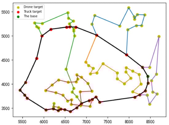 (2) Analysis of experimental results: The surveillance route of the truck and drones is shown in Figure 9, where the bold line represents the truck route, and the fine lines of different colors represent the routes of the drones. From Figure 9, 29 targets are surveilled by the truck and 71 targets are surveilled by the drones. A total of six drones are needed. In addition, from the route shown in Figure 9, the main route of the truck is relatively smooth, while remote surveillance targets and the surveillance targets that may cause round-trip trends are surveilled by drones, which significantly reduces the total cost.