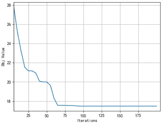 Figure 10 presents the convergence curve of the proposed ASALN algorithm. The termination conditions of ASALN adopts the termination criteria of simulated annealing, where the temperature would drop at each iteration until the termination temperature is reached. Specifically, the parameters are set as follow: the initial temperature is set to 6000 C, the terminating temperature is set to 100 C, and the cooling ratio R is set to 0.9. From Figure 10, the objective function value converges at the 64th iteration, and the number of iterations is within an acceptable range. In the first 20 iterations, the objective function value converges quickly, and the operator’s reconstruction of the initial solution is more intense. In the iterative process, the convergence curve can continuously find a promising solution. The reason can be speculated to be that the ASALN algorithm allows multiple neighborhoods to be searched in a single search, which increases the diversity of solutions. Meanwhile, the SA algorithm can jump out of the local optimum, and the TS algorithm can avoid reducing the repeated search of the solution space of poor quality to improve the search efficiency of the ASALN method.
