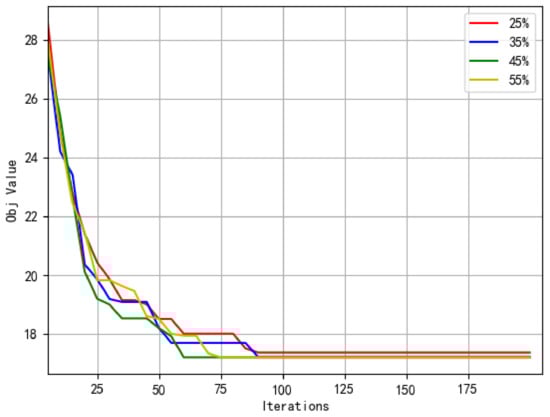In addition, the influence of the drone surveillance target scale on algorithm convergence in the initial solution is shown in Figure 11. By observing the convergence of different curves, it can be seen that the curves can converge quickly in 100 generations. It can be inferred that this is the optimization effect of the proposed ASALN algorithm on the initial solution. Although the proportions of drone surveillance targets in the initial solution are different, the initial solution is destroyed and repaired by the proposed ASALN algorithm, which makes the proportion of drone surveillance targets and truck surveillance targets in the final solution tend to be the same. Therefore, the above convergence curves of four scales can converge well and there is little difference between the convergent values. However, the different scales of drones in the initial solution lead to different convergence rates of the proposed ASALN algorithm. Specifically, as the proportions of drone surveillance targets go from 25% to 45%, the scale of the drone surveillance target in the initial solution gradually enlarged and the convergence rate becomes faster. When the proportion of drone surveillance targets in the initial solution reaches 55%, the convergence rate of the proposed ASALN algorithm becomes slowed down. When the proportion of drone surveillance targets in the initial solution is 65%, there is no feasible solution due to the limited number of drones.