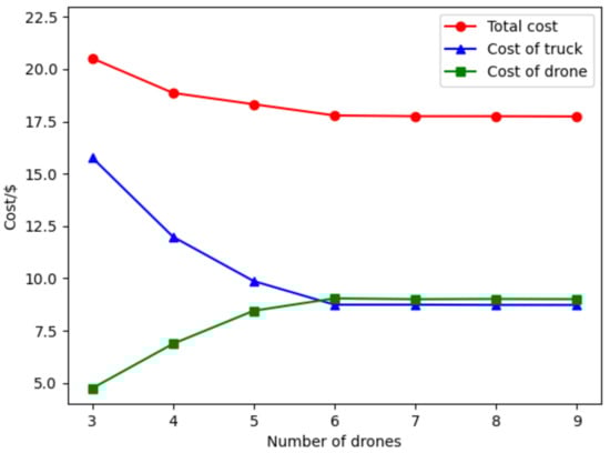 From Figure 12, as the number of vehicle-mounted drones increases, the targets in the best solution can make cost-savings after changing their surveillance mode, and the targets can be surveilled by the drones, thus saving cost. Therefore, it is necessary to explore the appropriate number of vehicle-mounted drones for a specific case. As the number of vehicle-mounted drones increases from 3 to 9, the average number of targets surveilled by drones is decreased, and some targets that are originally surveilled by trucks become surveilled by drones. Combining the results in Table 4, the cost of surveilling targets by the truck decreases, while the cost of surveilling targets by drones increases, and the total cost decreases. Specifically, the total cost decreased from $20.52 to $17.74, a reduction of 13.6%. Truck costs decreased from $15.78 to $8.73, a reduction of 44.7%. Drone costs increased from $4.74 to $9.01, an increase of 90%. By observing the curve trend in Figure 12, it can be seen that with the increase in the number of vehicle-mounted drones, the rate of total cost reduction gradually slows down. When there are more than 6 drones, the total cost remains constant. In this case, the drones appear idle, and blindly increasing drones may produce more costs. The endurance of drones becomes the main constraint. In addition, as the operators in the ASALN algorithm always give priority to the target that saves the most costs, the rate of cost-savings should be expressed as high to low, which is consistent with the results in Figure 12.
