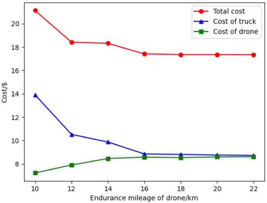 (C) Sensitivity analysis of drone endurance: Drone endurance, as an important parameter of a drone, determines the maximum number of surveillance targets in a flight, and the reasonable selection of different drone endurances is of great help to save costs. To investigate the influence of the drone endurance on total cost, the drone endurance is set to 10–22 km, and the experimental results are shown in Figure 13.