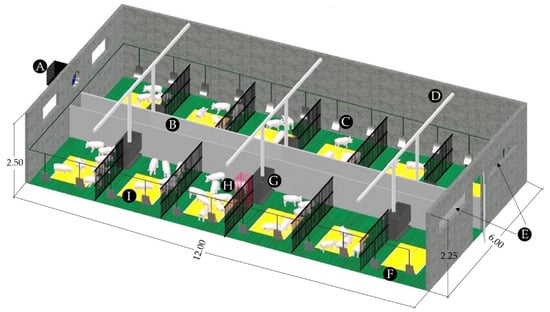 The air conditioning system comprised ventilation and warm water underfloor heating facilities. Environmental control was performed in the building through a temperature probe, without altering the usual conditions of the farm. The setpoint temperatures (TS) defined for environmental control were between 26 and 23 °C with a bandwidth of ±1.5 °C, and decreased gradually with the increase in the age and weight of the animals (Table 1). Clean air entered the room through two windows with air deflectors on the wall opposite to the fan (Figure 1E). The animals were provided feed ad libitum through a screw conveyor system with a feeder shared by two pens. Water was supplied through two drinking cups in each pen.