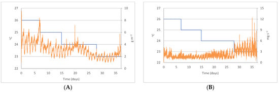 The CO2 concentration in the building reached its peak with the highest setpoint temperature, 26 °C, set at the start of the cycle, and decreased as animals grew and the setpoint temperature was reduced (Table 3, Figure 2A). The mean CO2 concentrations for every setpoint temperature were lower than the measurements reported by [42], although concentrations were always in the range reported by a number of authors for pig farms [43,44,45]. In summary, the CO2 concentration declined as the animals grew. In contrast, another study reported increasing concentrations [13], which may be caused by the different ages of the animals (28 days vs. 37 days). As a result of age difference, higher temperatures and lower ventilation rates were required in our study to ensure animal welfare conditions. Actually, a trend of increasing concentrations was observed in the final stage of the cycle analyzed in our study (Figure 2A).