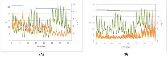 As shown in Figure 3B, during the first three days of the cycle, with TS = 26 °C, the outdoor temperature and CO2 emissions followed a similar pattern because of the effects of outdoor temperature on the ventilation system. On the following days, CO2 emissions decreased steadily until day 25, when outdoor temperature started to increase. During this interval, both variables showed a weak, inverse correlation (r = −0.475), which was in agreement with the correlation found by Ni et al. [46] for laying hens. This means that minimum emissions occurred at maximum outdoor temperatures. From that day until the end of the cycle, emissions followed a daily oscillation that was parallel to that of outdoor temperatures.