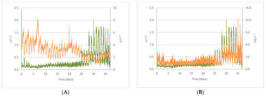 The ventilation flow was highly reduced during the first days of the cycle, until day 25, with a mean of 0.17 m3 s−1 and a maximum of 0.50 m3 s−1 (Figure 4). After that, a transition stage began for three days with a mean of 0.33 m3 s−1 and a maximum of 0.82 m3 s−1. From day 28, ventilation flow was significantly increased, with a mean of 0.74 m3 s−1 and a peak of 2.02 m3 s−1. Consequently, CO2 concentrations varied depending on the ventilation flow, such that, as the flow increased, concentration decreased both throughout the cycle [13] and on a daily basis [6]. Maximum CO2 concentrations (Figure 4A) of 9.50 g m−3 were measured during the first 25 days, when the highest mean value of 3.63 g m−3 was reached. This means that, as stated by [23] and contrary to what is usually anticipated, maximum CO2 concentrations occurred when the animals were younger. Furthermore, as the ventilation flow increased, the CO2 concentration decreased near the fan, and, therefore, in the building [24,25,47]. Thus, higher ventilation rates involved lower CO2 concentrations inside the facilities, albeit with higher emission rates [6].