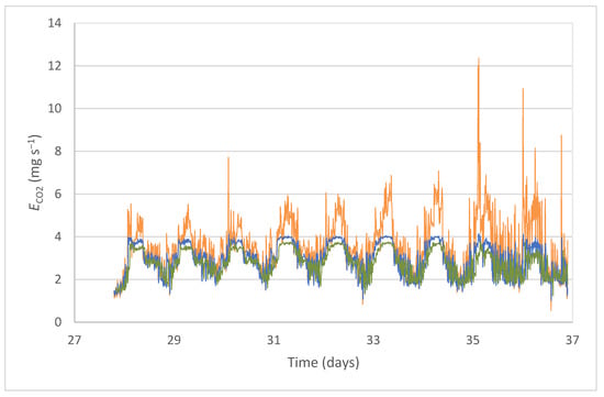 Expectedly, the 10 min prediction was more accurate than the hourly prediction, although statistical differences were minimal. In particular, r values of 0.63 and 0.56 were obtained with the 10 min and 60 min prediction models, respectively, whereas the RMSE values were 1.21 and 1.27 mg s−1, respectively. The prediction error of the models with regard to measured data in absolute terms (RMSE) was associated with very similar relative values (MARE), namely 0.23 for the 60 min prediction and 0.25 for the 10 min prediction. Figure 6 shows these differences. Furthermore, the hourly prediction model showed greater difficulty in predicting the peaks of CO2 emission.