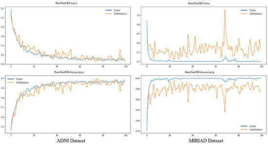 We evaluated the model based on the accuracy and categorical cross-entropy (loss) of classification AD and normal MRI images. Loss functions are intended to compute the quantity that a model should seek to minimize during training. Figure 5 shows the performance of the proposed pretrained CNN model ResNet-50 from training and validation for the ADNI and MIRIAD datasets. Top graphs show loss vs. epochs; meanwhile, down graphs show accuracy vs. epochs; red from training and orange from validation results, while epochs equal 100.