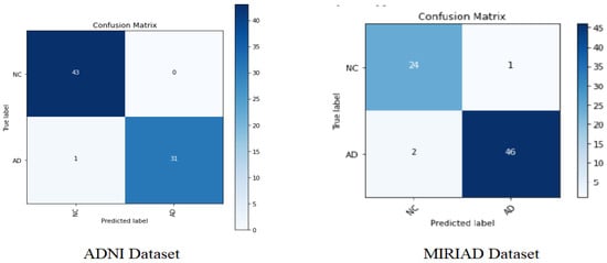 From Figure 6 and Table 4 and Table 5, it can be clearly observed that the proposed AD diagnosis model has been shown to be effective, with a favorable AD classification rate (96.875%) and a low false alarm of 3.125% for the ADNI dataset, and with an AD classification rate (95.83%) with a low false alarm of 4.16% for the MIRIAD dataset.