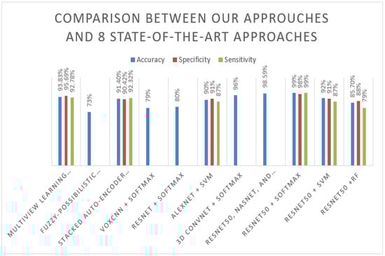 As shown in the previous sections, the proposed model has shown promising results on the ADNI [7] and MIRIAD [18] datasets with three different classifiers, with accuracy, specificity, sensitivity, and F-measure. It gave good results, answering our first research question about the effectiveness of the proposed model needs and evaluating its classification performance compared to other approaches in the literature to assess its effectiveness. To achieve that, we need to compare its performance against some of the state-of-the-art approaches discussed in our literature review. The approaches in the related work section were tested on the MRI of the ADNI [7] dataset. We compared the obtained results on ADNI with our proposed method in all three approaches (ResNet-50 + Softmax, ResNet-50 + SVM, and ResNet-50 + RF). Table 6 shows the results of our proposed model on the ADNI dataset in comparison to the results obtained by other approaches. From the results, it can be clearly seen that the proposed ResNet50-Softmax approach achieved very high performance of 99%, close to the approach result proposed by Huanhuan et al. [5], which combines three pre-trained models, including ResNet50, and achieves 98.59%. In addition, the proposed approach using different techniques such as MRI image smoothing, add batch normalization, and dropout layers that improve the network performance, compared with the ResNet50-Softmax approach proposed by Korolev et al. [13], is one of the proposed approaches using the same pre-train model ResNet50 without add batch normalization, or dropout and achieves only 80%. On the other hand, ResNet50 + SVM obtains a good result compared with [6,9,13,16]; it achieves 92% accuracy. In addition, ResNet + RF outperform three approaches that are the fuzzy-possibilistic tissue segmentation + SVM approach [9], VoxCNN + Softmax, and ResNet50 + Softmax proposed by [13]. Figure 7 below represents the results in the flow chart.